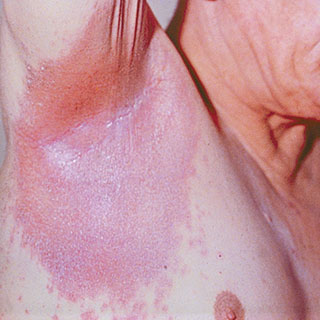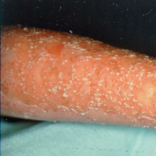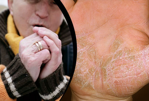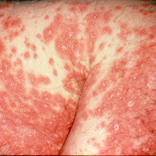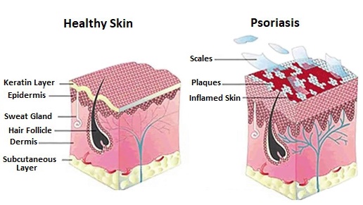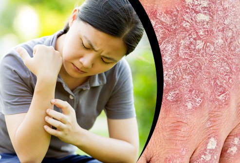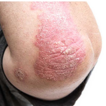 Plaque psoriasis is the most common form of the disease and appears as raised, red patches covered with a silvery white buildup of dead skin cells or scale. These patches or plaques most often appear on the scalp, knees, elbows and lower back. They are often itchy and painful, and they can crack and bleed.